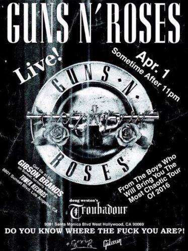 Korábban csak pletyka szinten keringett a meglepetés-buli híre, de néhány órával a kezdés előtt megerősítették: 2016. április elsején, pénteken koncertet ad a Guns N' Roses eredeti felállása - pontosabban annak három oszlopos tagja, Axl Rose, Slash és Duff McKagan. A koncert kezdetéig nem lehetett tudni, kik kísérik őket színpadon, de végül kiderült: Richard Fortus gitáros, Dizzy Reed billentyűs és Frank Ferrer dobos. Mellettük egy feltörekvő másod-billentyűs, Melissa Reese is feltűnt.