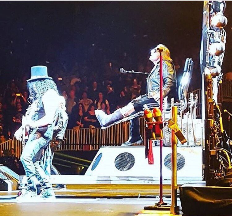 A hírek szerint az énekes még a múlt heti Troubadour-beli koncert során csúszott meg, és törte el lábának egyik csontját, a 'Mr. Brownstone' című szám előadása közben. Rose egy kisebb sípcsont-műtéten is átesett április első hetében; így komolyabb gond nélkül színpadra tudott lépni bandája első teljes értékű reunion-buliján. Habár Axl egy "trónon" ülve, begipszelt lábbal énekelte végig a koncertet, a show élvezeti értékét ez sem vette el - olvasható egy beszámolóban. Rose közölte a jelenlévő rajongókkal, hogy a "trónt" Dave Grohl-tól kapta kölcsön (a Foo Fighters frontembere nemrég hasonló balesetet szenvedett): "Szeretném megköszönni Dave Grohl-nak. Kedves tőle, hogy ideadta ezt a szerkezetet. Enélkül most tényleg nem tudnék mit kezdeni a helyzettel...".